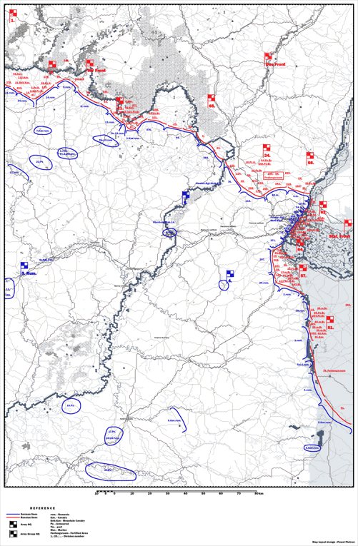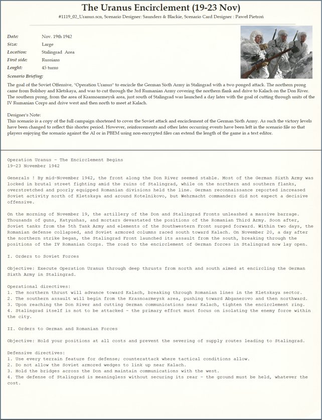 For Stalingrad, there is both a Scenario Card and game maps with overlay. See the (reduced) samples below: