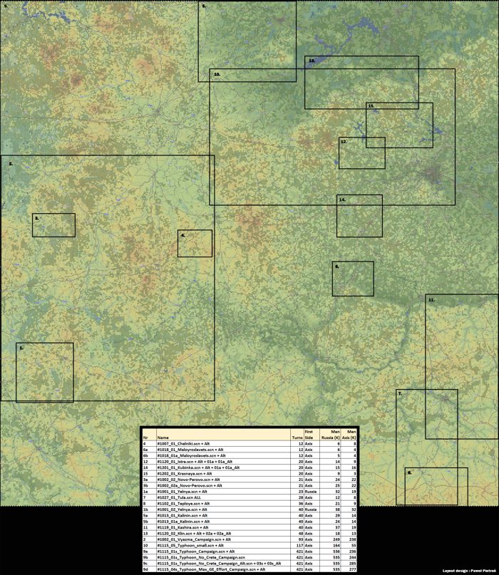 For Moscow there are two versions of the game map (white and colour) as well as a scenario map showing where each scenario is on the master game map.
