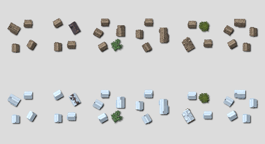 2D also requires significant additional work. We want to align the graphics between 3D and 2D. You can, hopefully see the similarity when you look at the ground textures across the various zoom levels. This alignment requires a lot of new 2D graphics, and we continue to plod through there creation. The following image shows a sample of potential top-down village buildings in both summer and winter form.