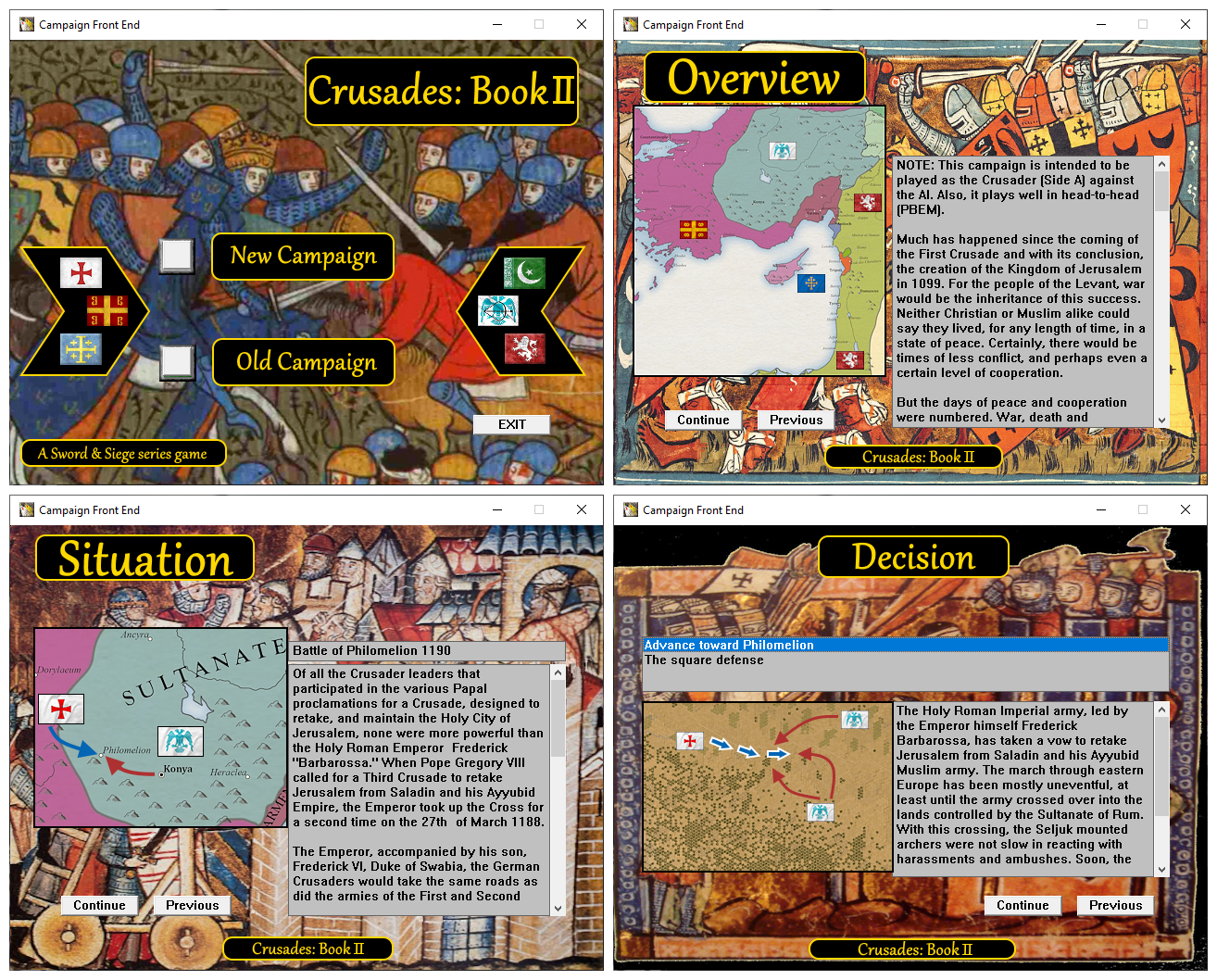 Crusades: Book II provides multiple play options including play against the computer AI, Play by E-mail (PBEM), LAN & Internet "live" play as well as two player hot seat.