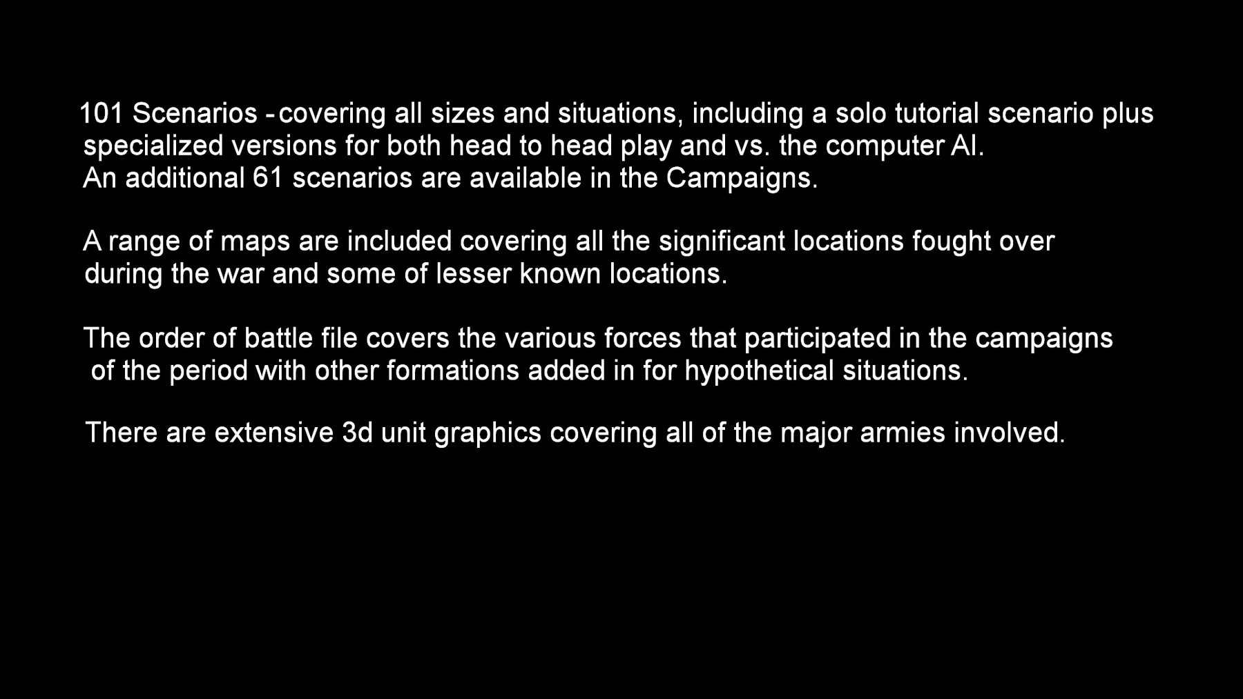 The order of battle files cover the various forces that participated in the campaigns with other formations added in for hypothetical situations.